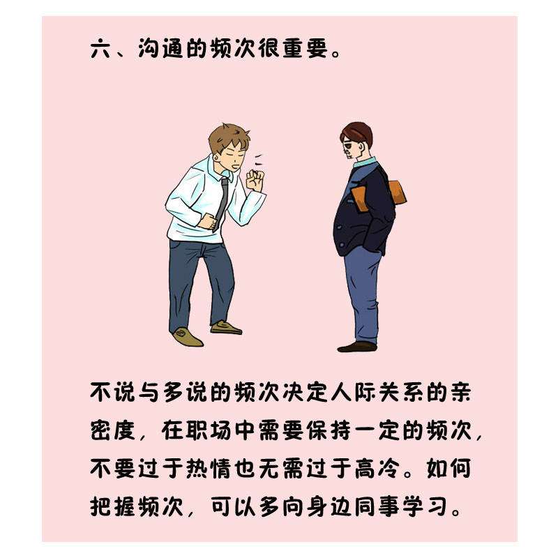 不说与多说的频次决议人际关系的亲密度,,,,在职场中需要坚持一定的频次,,,,不要过于热情也无需过于高冷。。。。。。。怎样掌握频次,,,,可以多向身边同事学习。。。。。。。